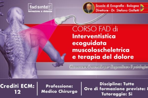 Le procedure interventistiche ecoguidate spaziano da metodiche tecnicamente più semplici, quali infiltrazioni articolari e peri-articolari, a interventi notevolmente piuù complessi come i blocchi antalgici perineurali, lavaggi di depositi calcifici intra-tendinei (ad esempio la TPE: trattamento percutaneo ecoguidato), biopsie dei tessuti molli, “needling” tissutali selettivi e scollamenti tissutali.